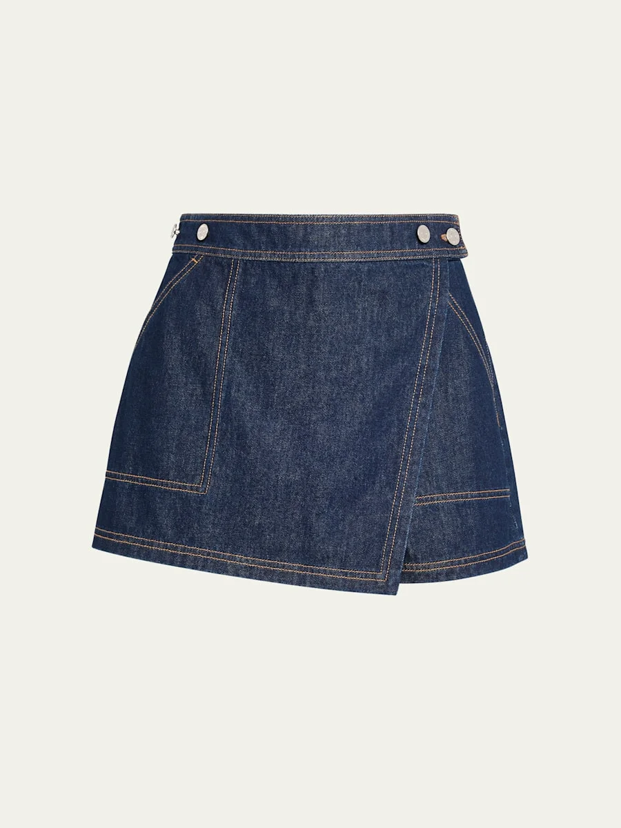 Veronica Beard "Winslet" denim skort finished with contrast topstitching High rise Front and back patch pockets Wrap silhouette Mini length Side button closure Cotton Machine wash cold Imported Online Inquiries: BGS21_T6NLB| Store Inquiries: #5021289