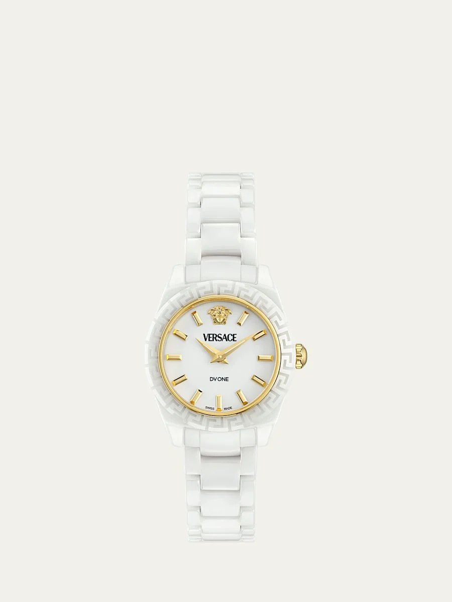 Versace bracelet watch 28mm case in white ceramic Greca detailing at the bezel White enamel dial; baton indices Medusa and logo text at 12 o'clock Two-hand quartz movement Ceramic bracelet strap; deployant buckle Water resistant to 3 ATM Made in Switzerland Online Inquiries: BGS21_Y7921| Store Inquiries: #4872665