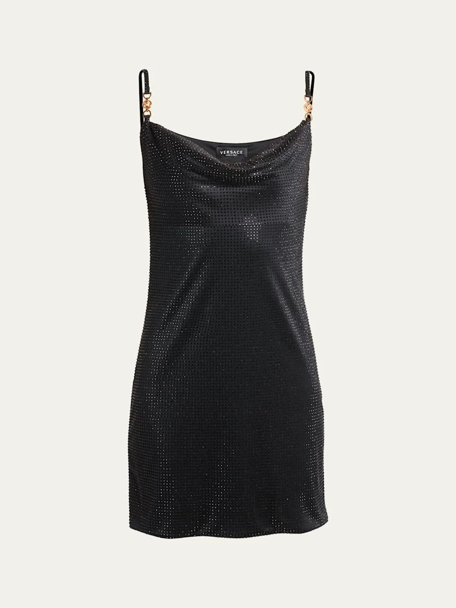 Versace shiny jersey dress featuring allover strass embellishment and signature Medusa strap detail Cowl neckline Sleeveless Slip silhouette Mini length Invisible side zip Viscose Made in Italy Model is 5'10"/177cm. Online Inquiries: BGS21_B8GLD| Store Inquiries: #4554193