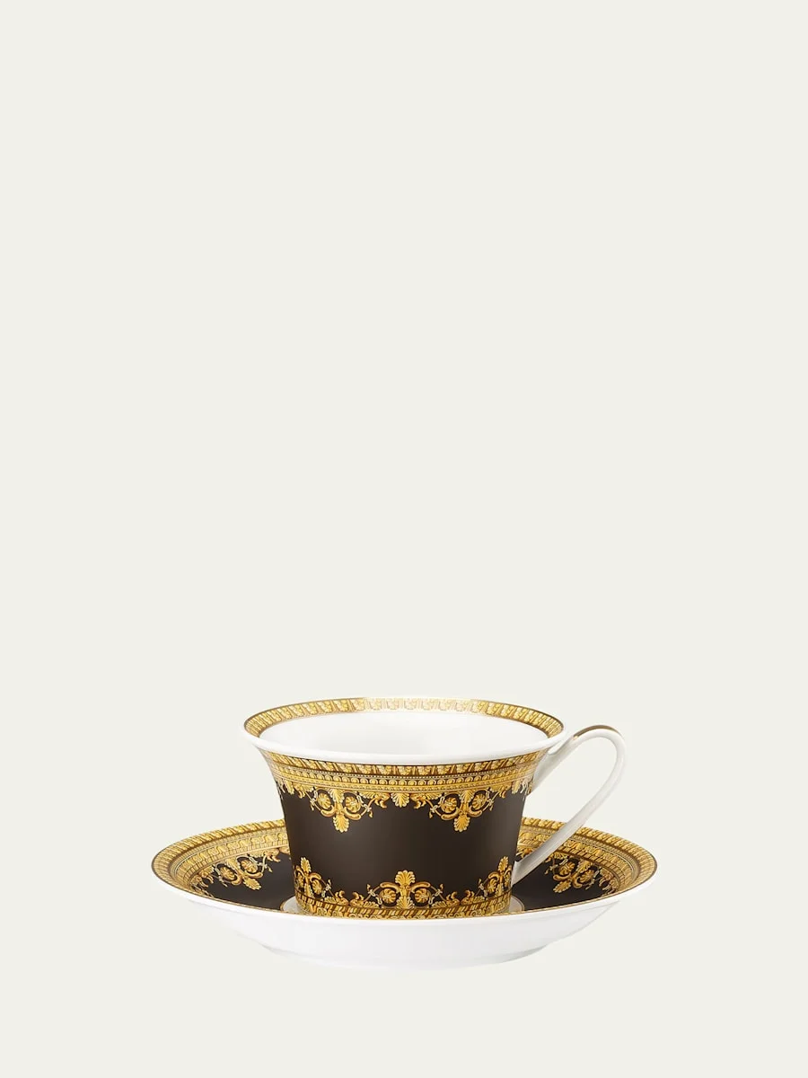 Porcelain tea cup and saucer. Cup holds 7 ounces. Dishwasher safe. Imported.