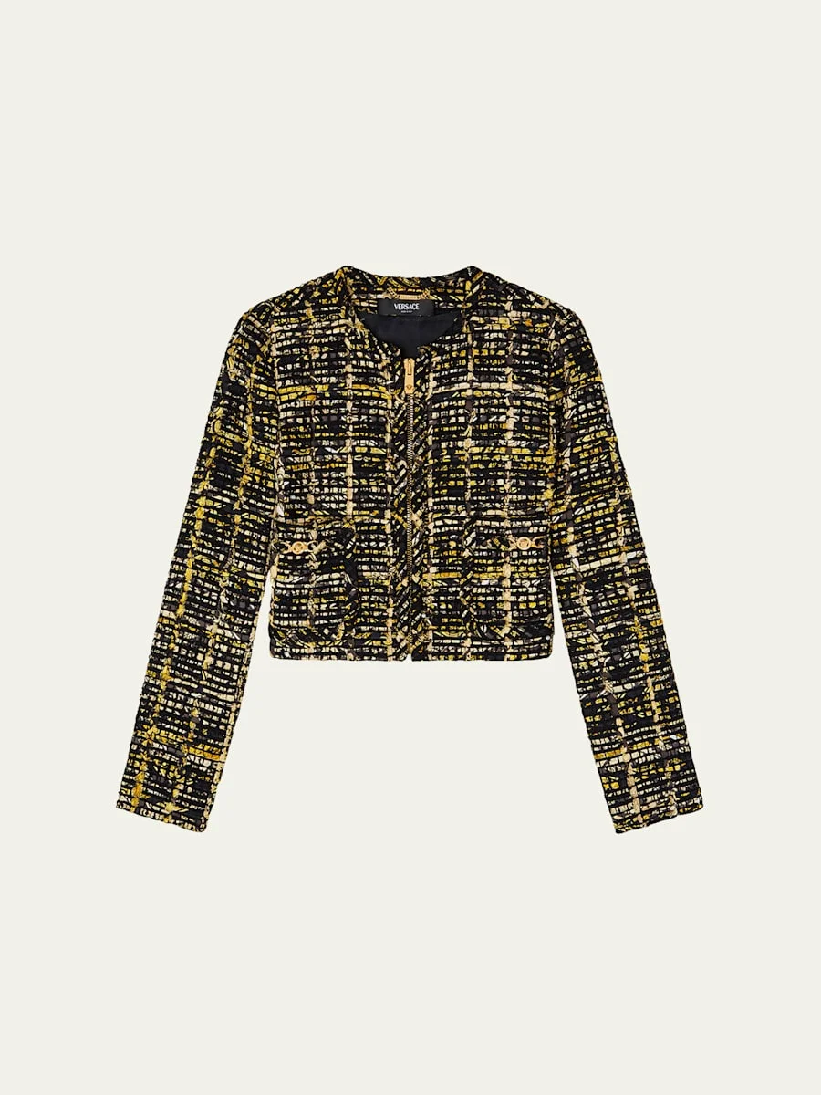 Versace jacquard informal jacket featuring signature goldtone Medusa details on the pockets Round neckline; zip front Long sleeves Hip patch pockets Straight fit Hip length Nylon/polyamide/cotton/polyester Dry clean Made in Italy Online Inquiries: BGS21_BA9D7| Store Inquiries: #5060511