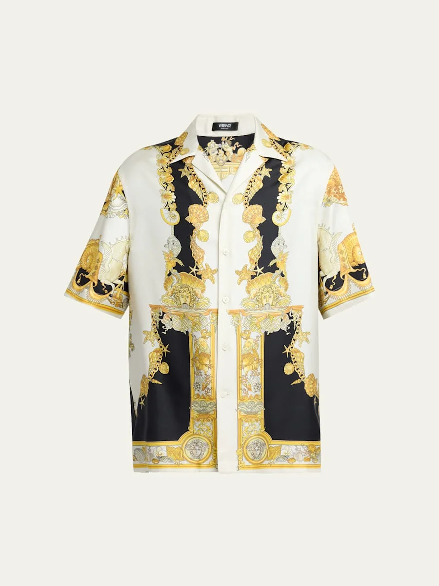 Versace camp shirt from the La Vacanza Collection Coral Theatre print depicting corals, shells, and mermaids with theatrical elements Notched collar Buttondown front Short sleeves Relaxed fit Silk Professionally clean Made in Italy
