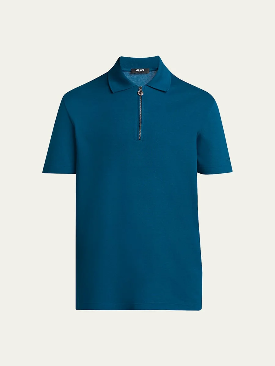 Versace polo shirt in soid pique Classic collar Quarterzip placket Signature Medusa zipper pull Short sleeves Regular fit Cotton Dry clean Imported