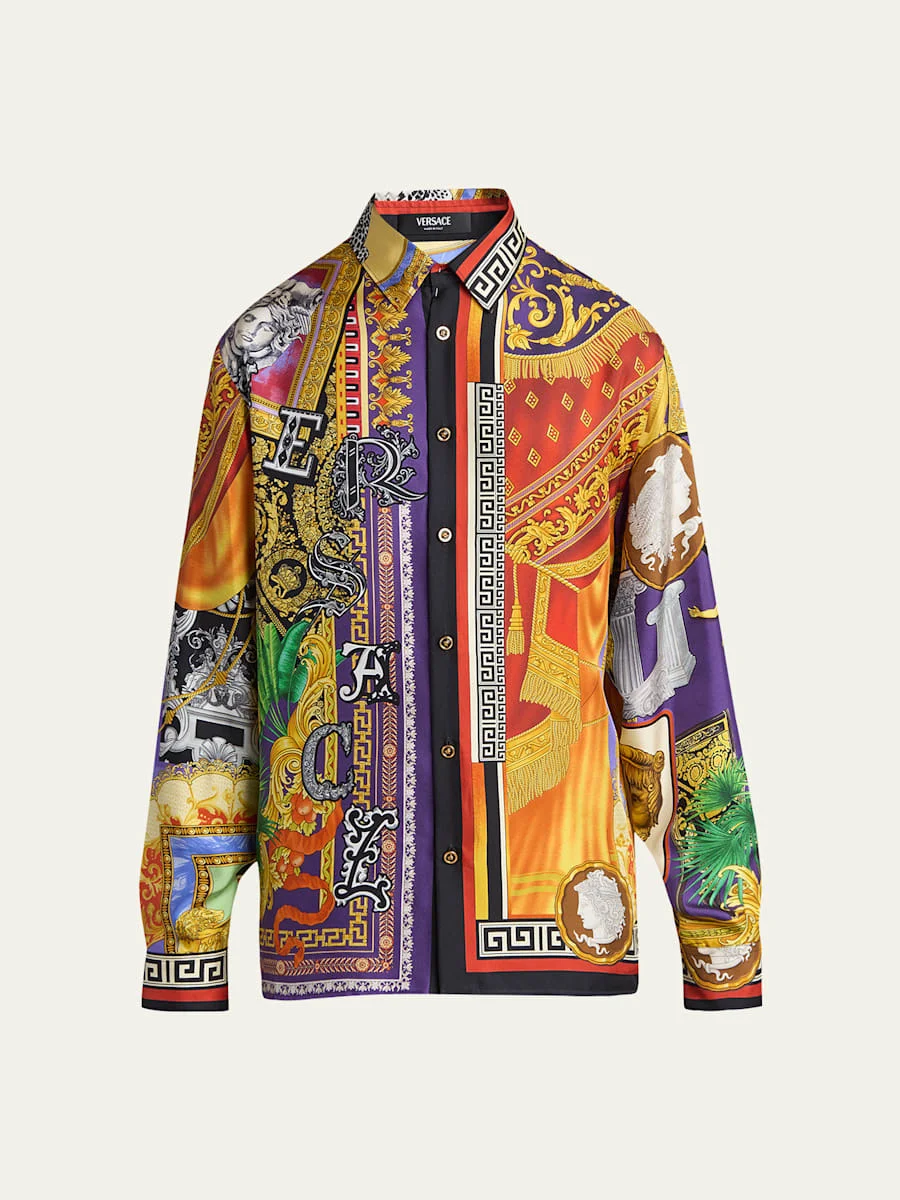 This Versace silk twill buttondown shirt showcases a bold Patchwork pattern, depicting a collage of archival House prints from the latest Versace collections. Enamel Medusa buttons Point collar Button front Long sleeves Singlebutton cuffs Straight hem Classic fit Silk Made in Italy