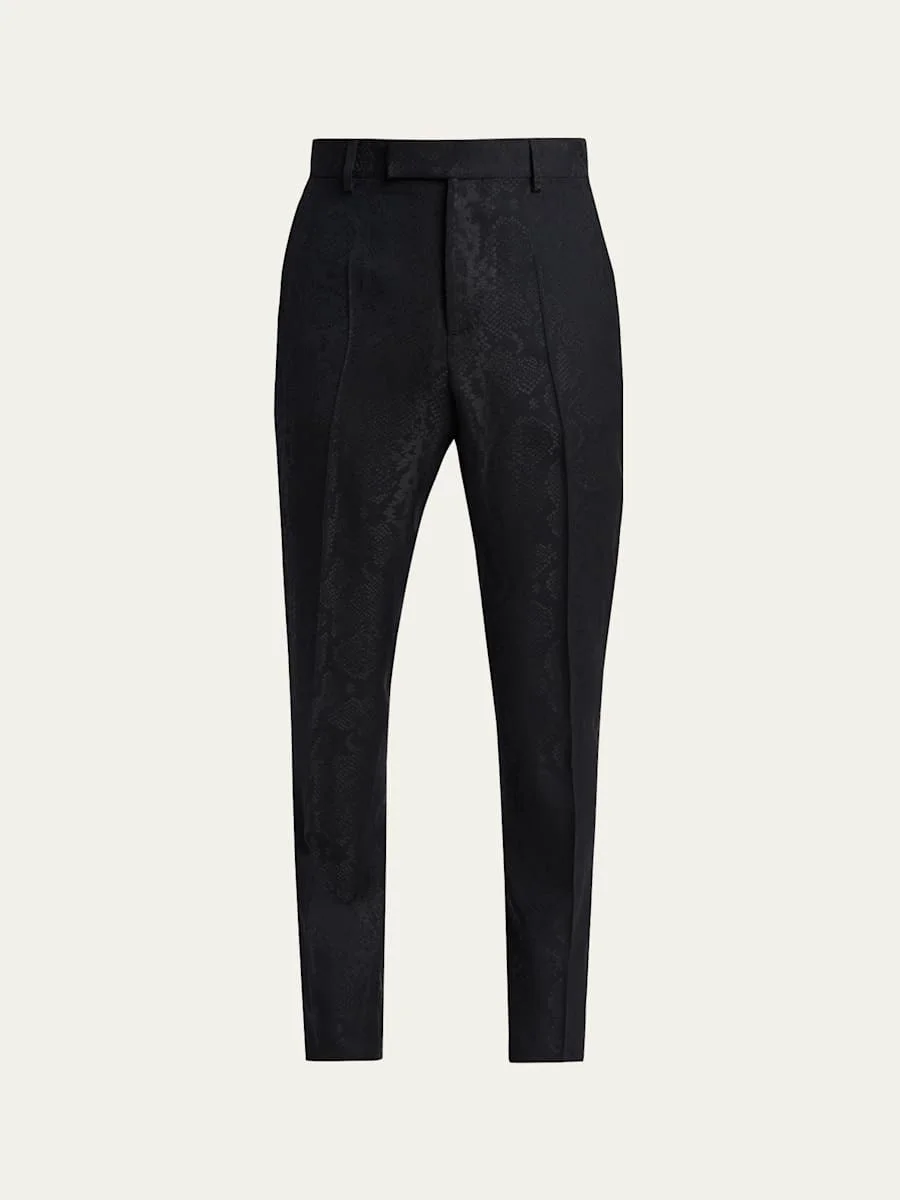 Cut from tonal python jacquard, these Versace formal pants fuse an exotic pattern with precision tailoring through a crisp front pintuck Regular rise Side pockets; back welt pockets Straight legs taper slightly toward the ankle Tabhook/zip front; belt loops Virgin wool/viscose Lining: Cotton Made in Italy