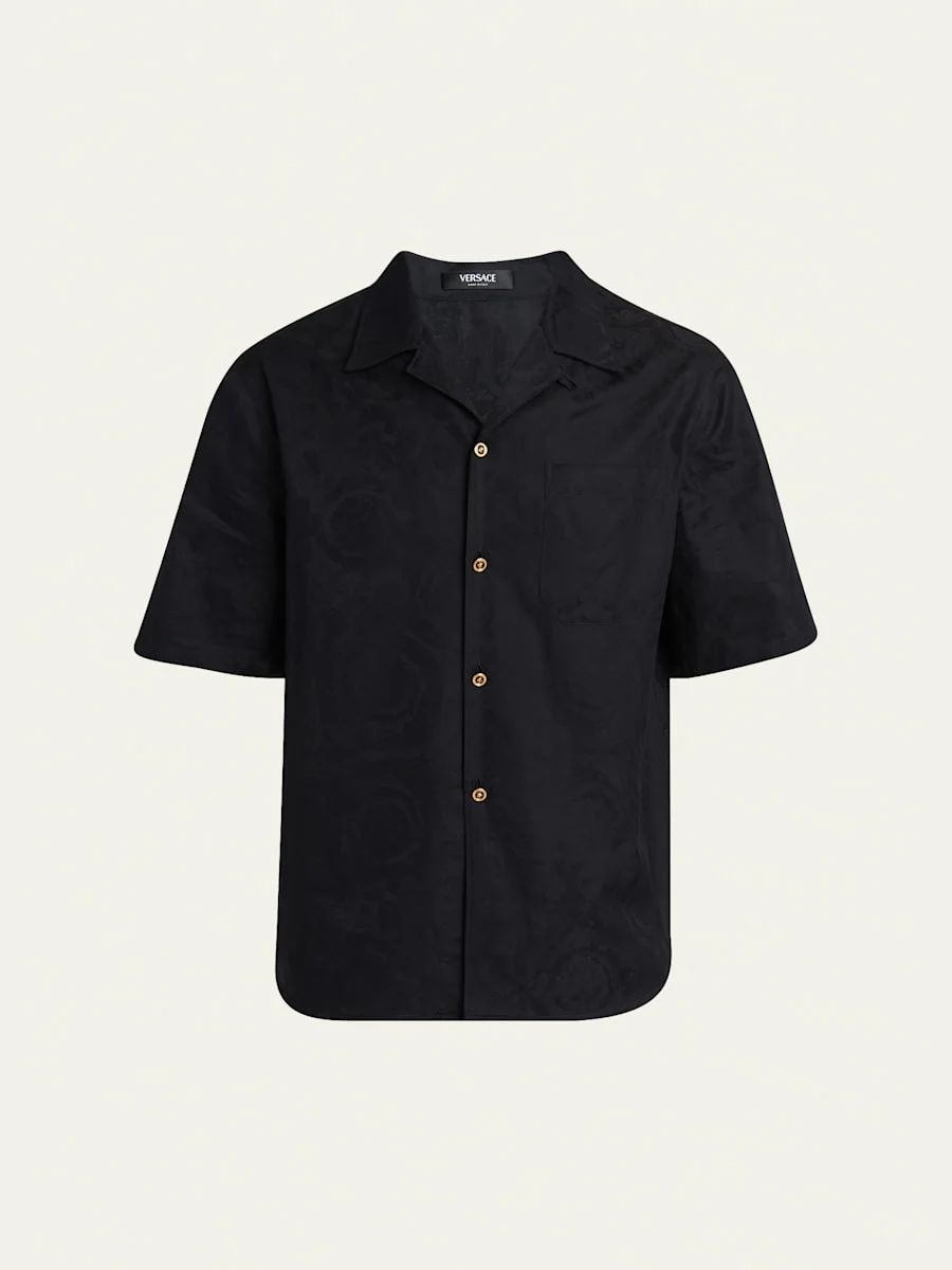 Versace sport shirt featuring the iconic Barocco motif in tonal jacquard Camp collar Signature gold-tone Medusa buttons Chest patch pocket Short sleeves Regular fit Shirttail hem Cotton Professionally clean Made in Italy Online Inquiries: BGS21_NDG4R| Store Inquiries: #5037344