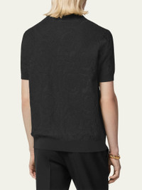 Versace knit polo shirt in a lightweight blend of cotton and silk Features an allover tonal Barocco pattern Spread collar Three-button placket Short sleeves Ribbed cuffs and hem Hem with embroidered logo Pullover style Silk/cotton Machine wash Made in Italy Model is 6'1"/185cm. Online Inquiries: BGS21_NCPCP| Store Inquiries: #4705380