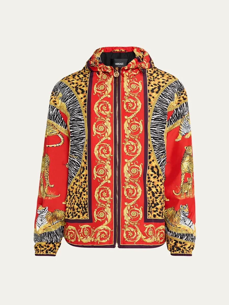 Versace jacket displaying a bold Wild Cat print, accented with baroque trim Hooded neckline Full-zip front Long sleeves Side slip pockets Polyester Lining: Cotton/nylon/polyester Dry clean Made in Italy Online Inquiries: BGS21_NDPFX| Store Inquiries: #5060845