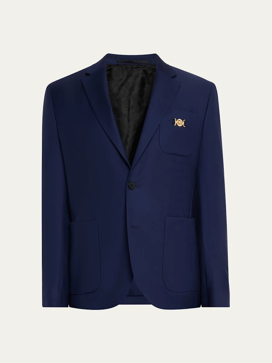Versace formal blazer in pure wool Features goldtone Medusa Biggie hardware Notch lapels Singlebreasted front Long sleeves with button cuffs Front patch pockets; interior welt pockets Slim fit Vented back Virgin wool Lining: Cotton/cupro Dry clean Made in Italy
