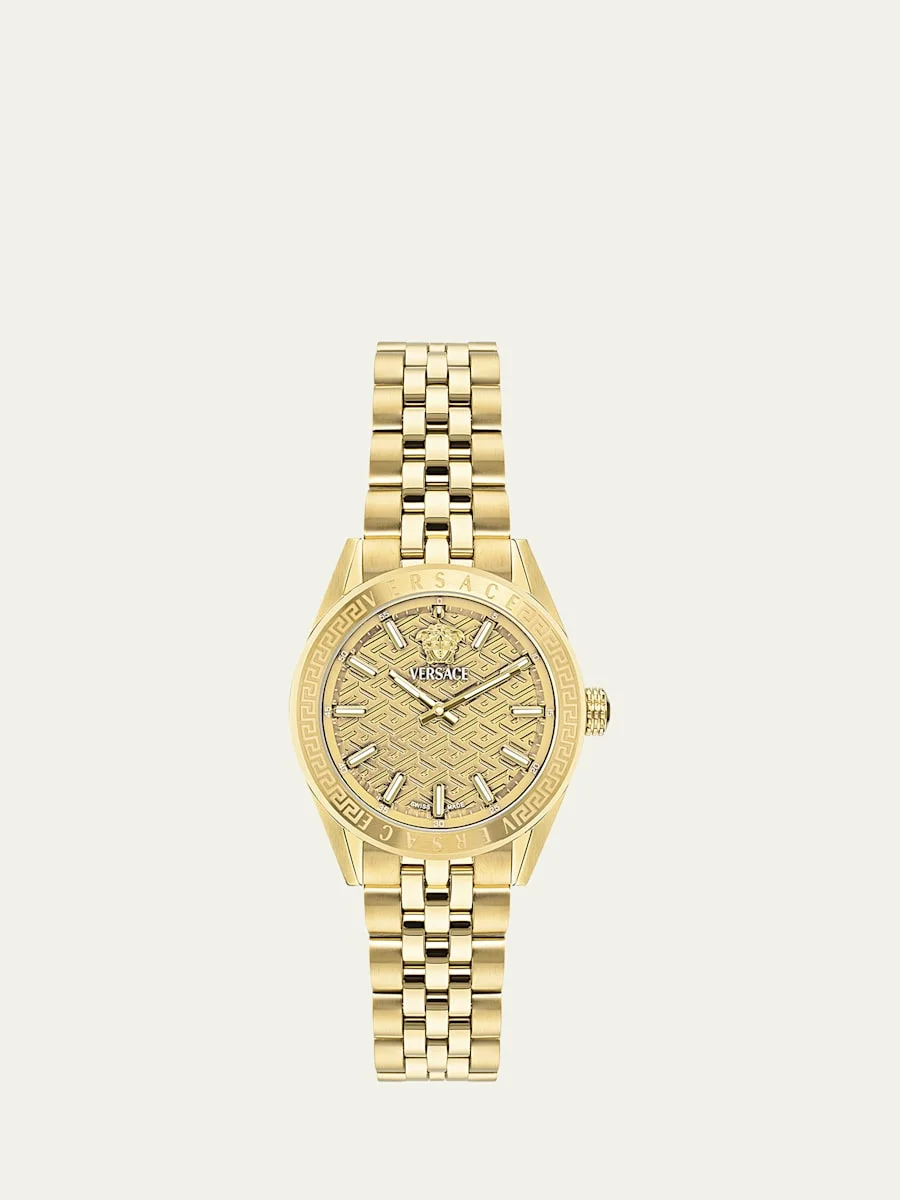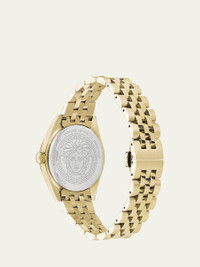 Versace analog watch with signature Greca detailing Approx. 36mm round yellow goldtone stainless steel case Yellow gold dial with baton indices Medusa logo at 12 o'clock Fivelink twotone bracelet strap Deployant buckle Quartz movement Spot clean Made in Switzerland