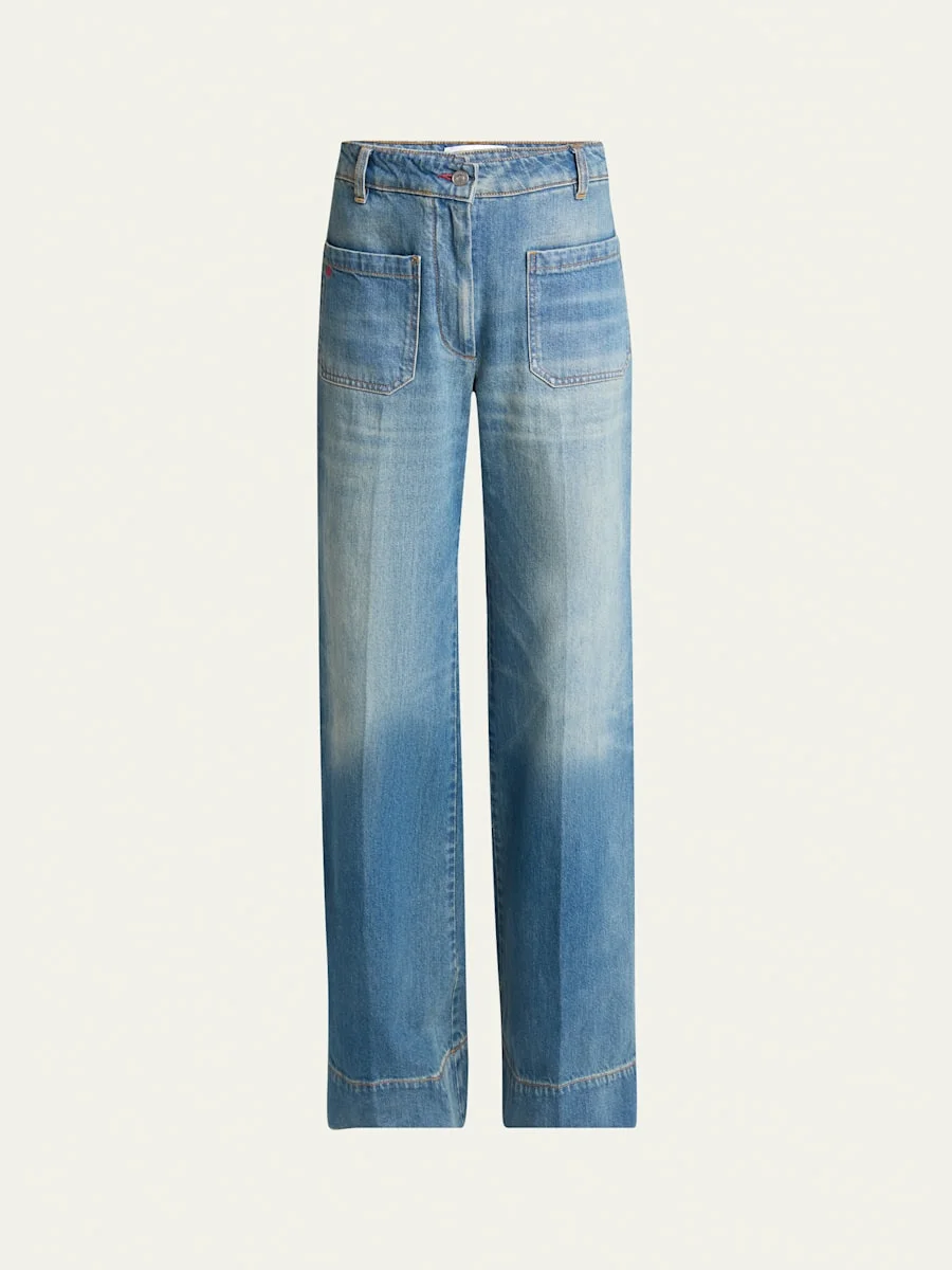 Victoria Beckham "Alina" jeans with an elongating silhouette and light whiskering Full length High rise Straight, wide legs Front and back patch pockets Button/zip fly; belt loops Cotton Dry clean Made in Italy