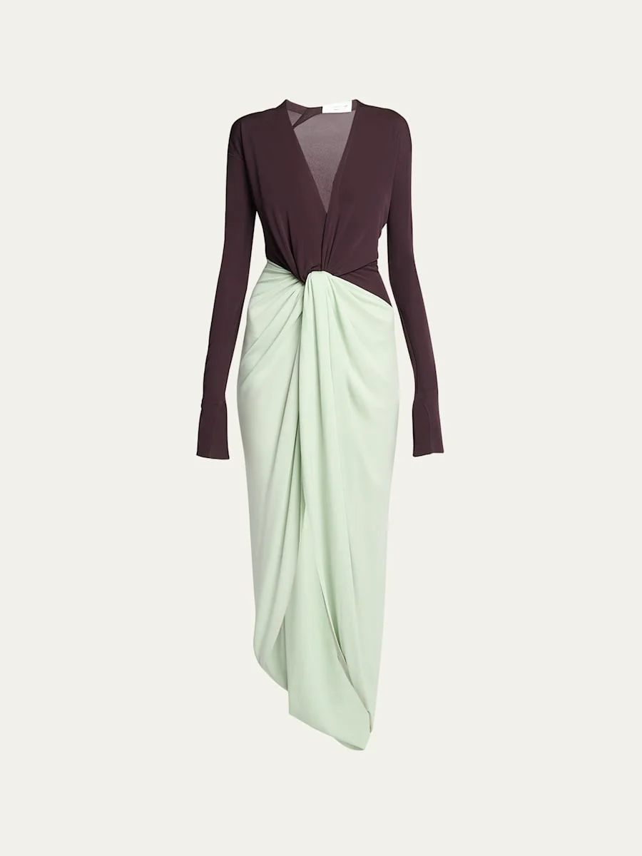Victoria Beckham colorblock jersey gown with a knot detail V neckline Long sleeves; slit cuffs Sheath silhouette Midi length High-low hem Viscose Dry clean Made in Portugal Model is 5'10"/177cm. Online Inquiries: BGS21_B9QEC| Store Inquiries: #4943099