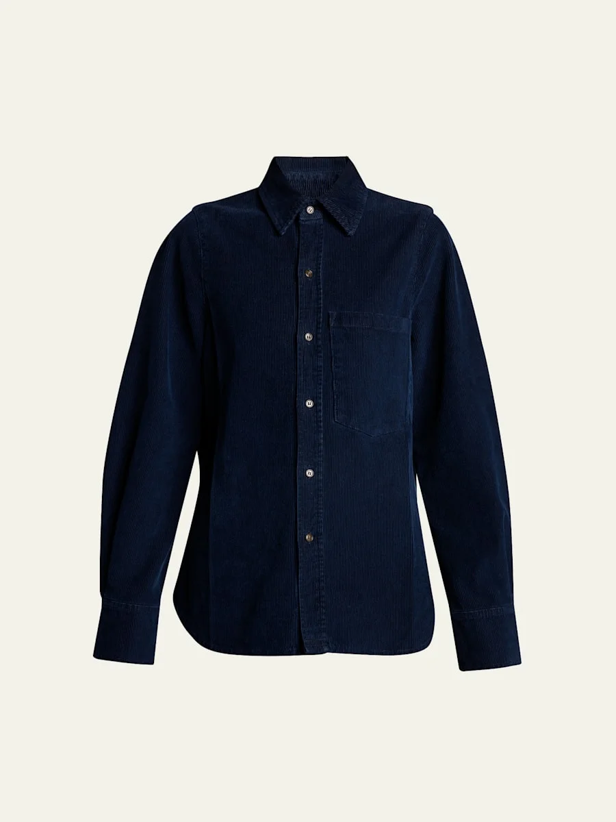 Victoria Beckham shirt is crafted of a soft corduroy Point collar; button front Long sleeves; barrel cuffs Chest patch pocket Yoked back; box pleat Loose fit Shirttail hem Cotton Dry clean Made in Italy