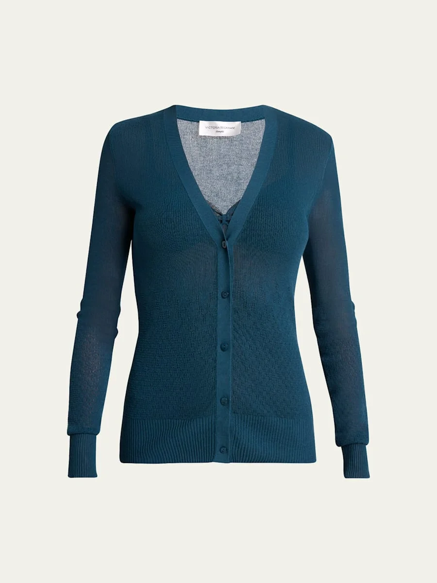 Crafted from sheer ribbed knit, this cardigan from Victoria Beckham features a degrade pointelle knit along the hem V neckline; button front Long sleeves Fitted Hem falls below the hip Ribbed cuffs and hem Cotton/nylon/polyamide Dry clean Imported