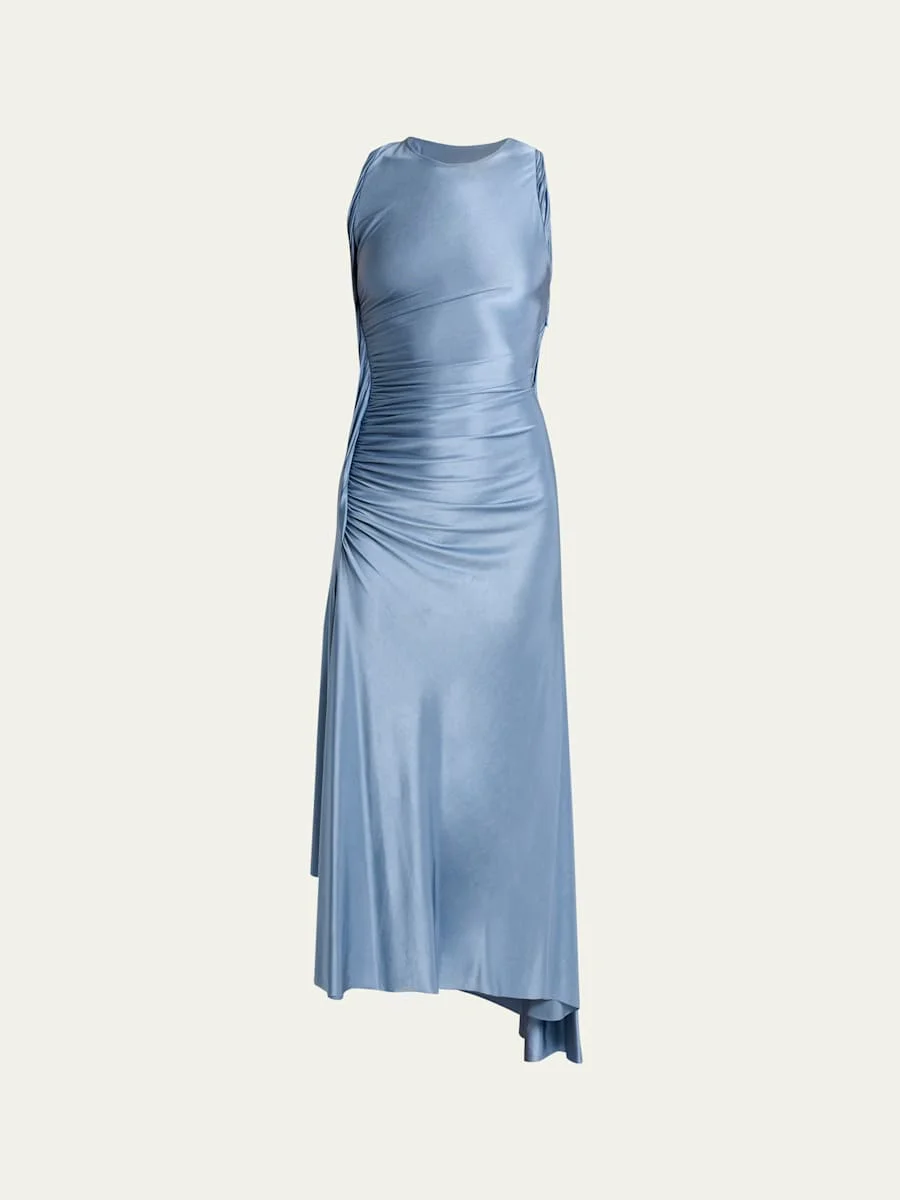This Victoria Beckham midi dress is cut from fluid satin, detailed with twisted trim and ruching that defines the figure Jewel neckline Sleeveless Asymmetric sideslit hem Hem falls below the knee Aline silhouette Invisible side zipper Viscose/elastane Dry clean Made in Portugal