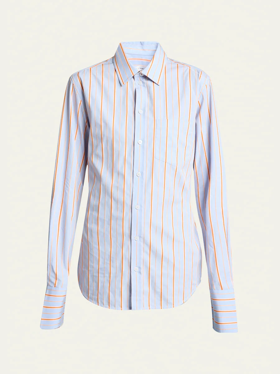 Victoria Beckham stripe motif shirt with a tab detail and back strap design Spread collar; button closure Long sleeves; button cuffs Chest patch pockets Tailored fit Back yoke Curved hem Cotton Dry clean Made in Portugal Online Inquiries: BGS21_BA4QX| Store Inquiries: #5035967