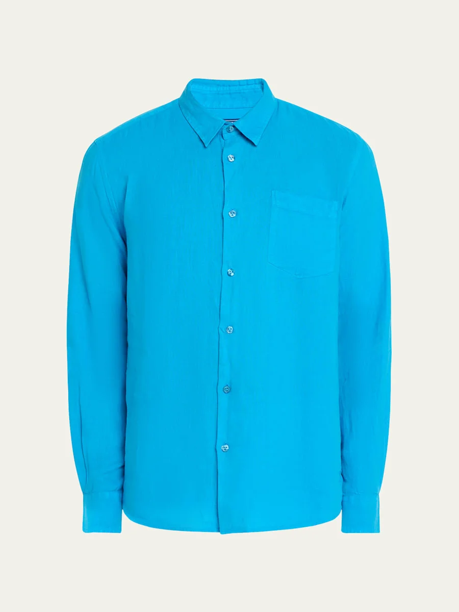 Vilebrequin "Caroubis" sport shirt in soft linen. Spread collar; button front. Chest patch pocket. Barrel cuffs. Regular fit. Side pleats at back yoke. Tonal turtle embroidery at hem. Imported. Model is 6'1"/185cm. Online Inquiries: BGS21_N75J6| Store Inquiries: #3448393