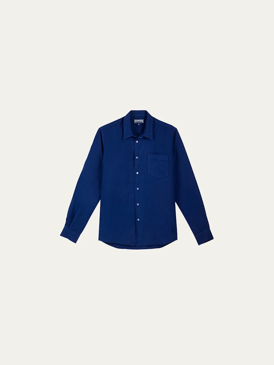 Vilebrequin "Caroubis" sport shirt in soft linen. Spread collar; button front. Chest patch pocket. Barrel cuffs. Regular fit. Side pleats at back yoke. Tonal turtle embroidery at hem. Imported. Model is 6'1"/185cm. Online Inquiries: BGS21_N75J6| Store Inquiries: #3448393