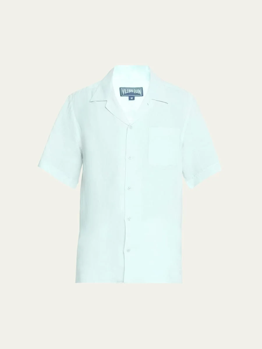 Vilebrequin sport shirt in organic linen Camp collar Button placket Chest patch pocket Short Sleeves Hand wash, machine wash cold, line dry Made in Italy Model is 6'1"/185cm. Online Inquiries: BGS21_NC27B| Store Inquiries: #4790404