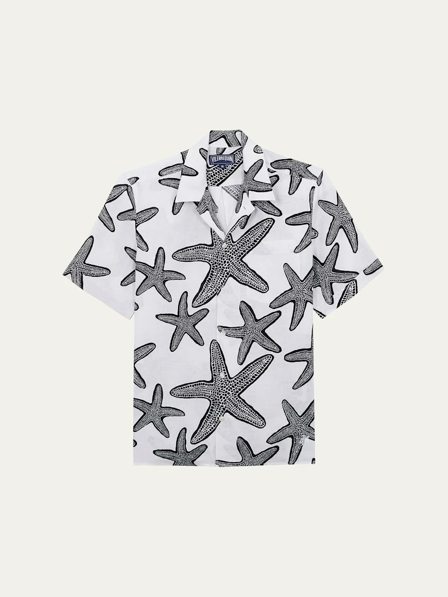 Vilebrequin camp shirt featuring a fun, oversized starfish print Notched collar Button closure Chest pocket Short sleeve; approx. 10.0"L Classic fit Side seam slits Linen Hand wash, machine wash cold, line dry Made in Morocco Online Inquiries: BGS21_ND2JD| Store Inquiries: #5003227