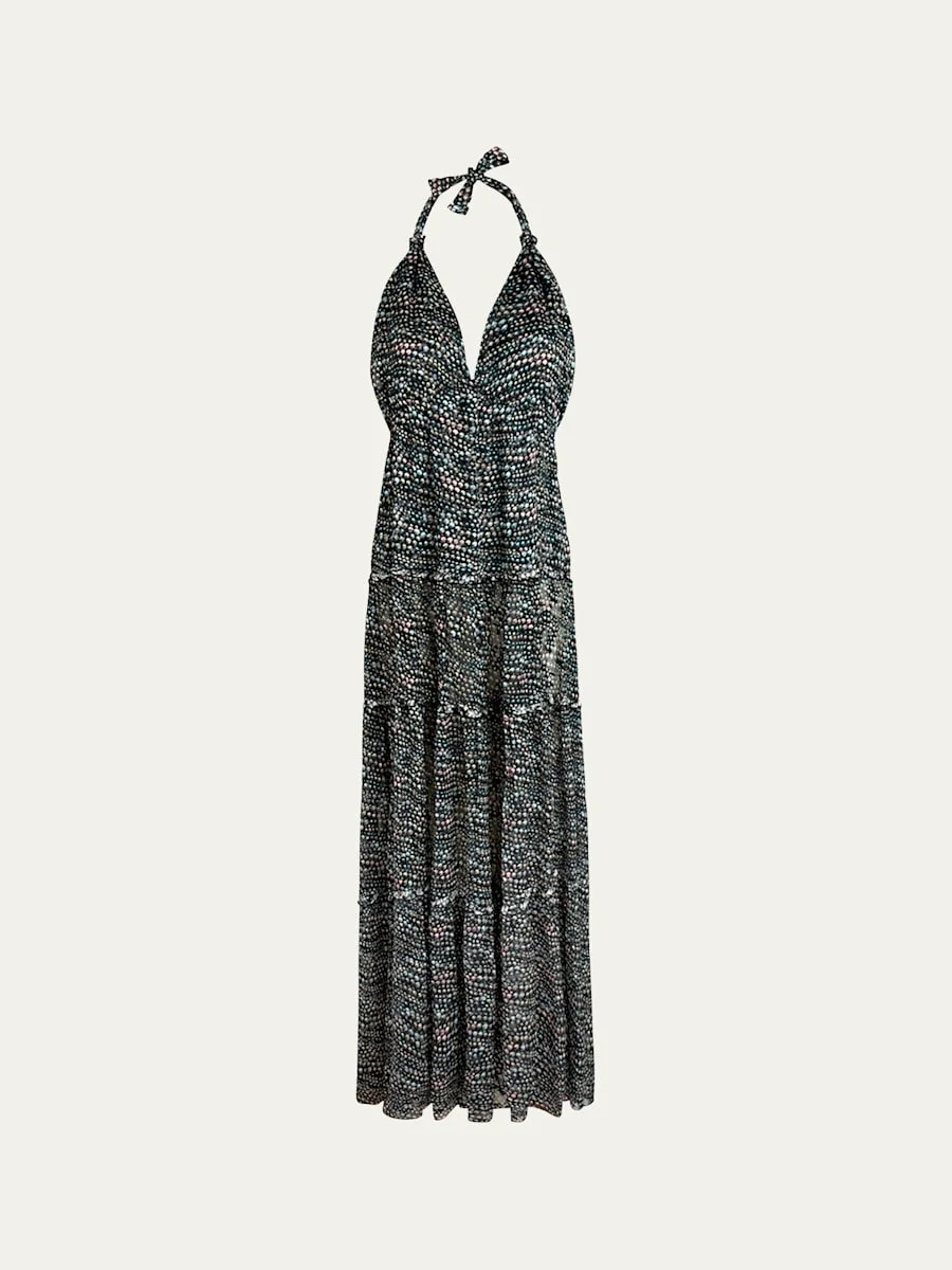 Vilebrequin tiered dress in Pearl print Halter neckline; self-ties behind the neck Sleeveless Open back Full length Slipover style Silk/metal Hand wash, machine wash cold, line dry Made in Morocco Model is 5'10"/177cm. Online Inquiries: BGS21_T68KJ| Store Inquiries: #4929428