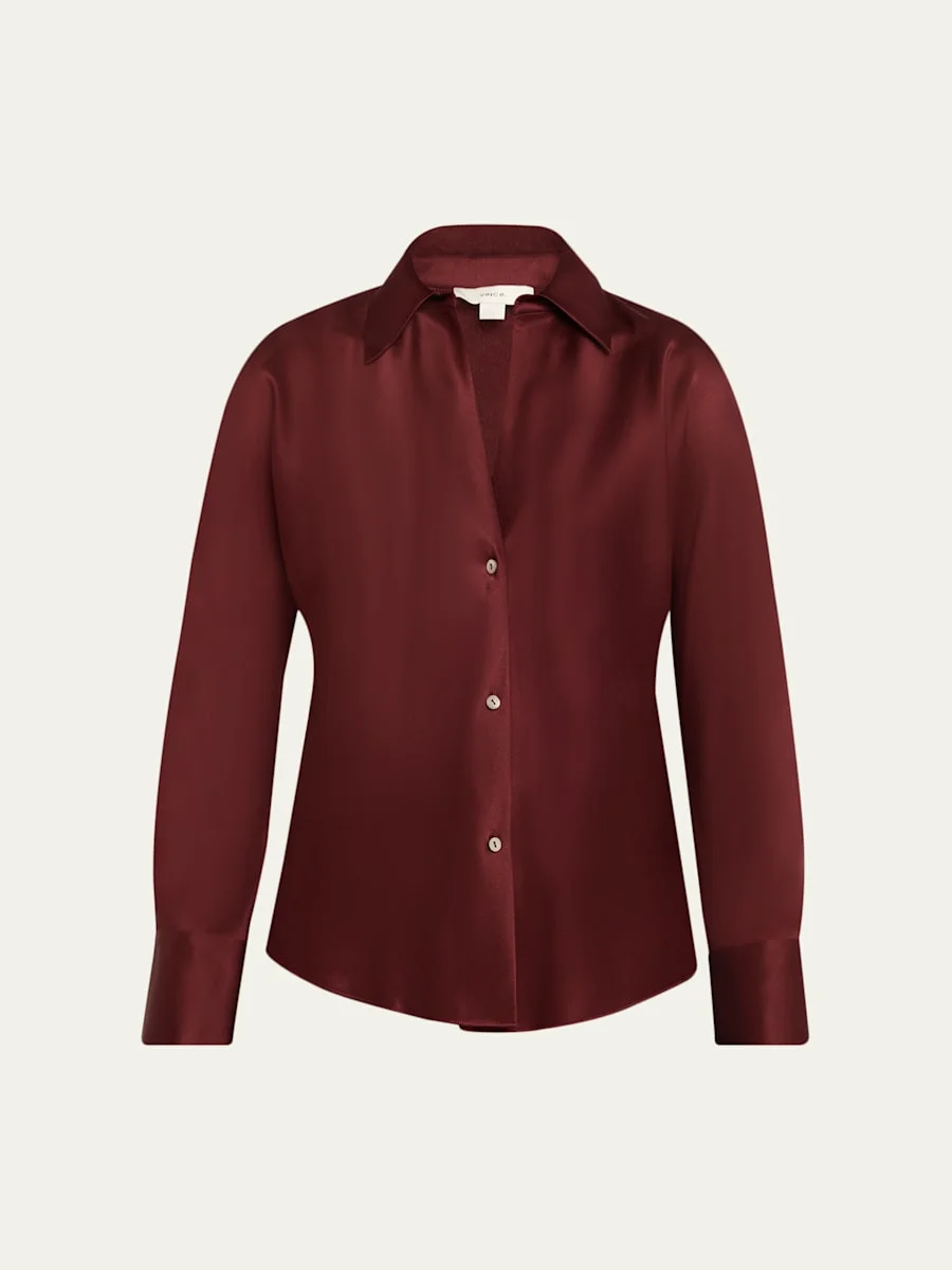 Vince bias-cut blouse rendered from silk charmeuse Spread collar; button front Long bishop sleeves Barrel button cuffs Curved hem Draped fit Silk Dry clean Imported Model is 5'10"/177cm. Online Inquiries: BGS21_T5Y2Q| Store Inquiries: #4856288