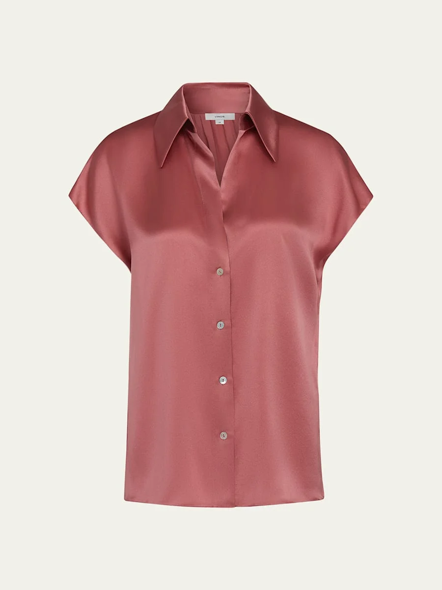 Vince sleek blouse adorned with pearly buttons Spread collar; button front placket Cap sleeves Ruched back Drapey fit Hip length Silk Imported Model is 5'10"/177cm. Online Inquiries: BGS21_T8W3R| Store Inquiries: #4556239