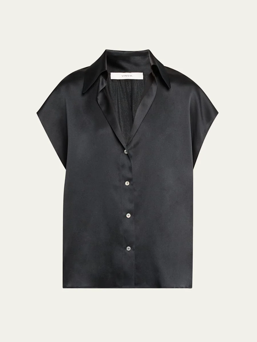 Vince sleek blouse adorned with pearly buttons Spread collar; button front placket Cap sleeves Ruched back Drapey fit Hip length Silk Imported Model is 5'10"/177cm. Online Inquiries: BGS21_T4SFY| Store Inquiries: #4556239