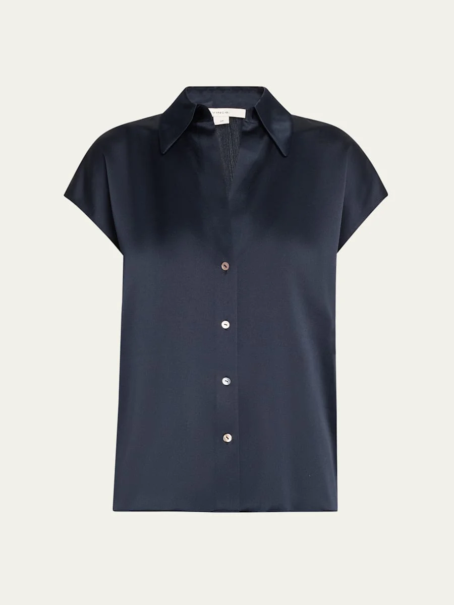 Vince sleek blouse adorned with pearly buttons Spread collar; button front placket Cap sleeves Ruched back Drapey fit Hip length Silk Imported Model is 5'10"/177cm. Online Inquiries: BGS21_T4SFY| Store Inquiries: #4556239