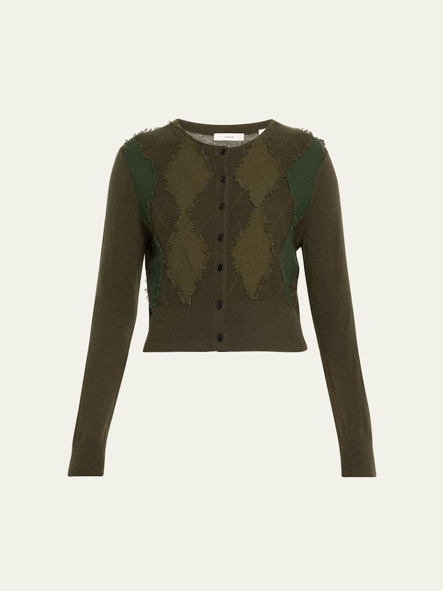 Luxurious wool and cashmere cardigan with hand-cut argyle detailing by Vince. Crew neckline Long sleeves Classic fit Cropped length Pullover style Wool/polyester/cashmere Hand wash cold or dry clean Imported Online Inquiries: BGS21_T855K| Store Inquiries: #5240026