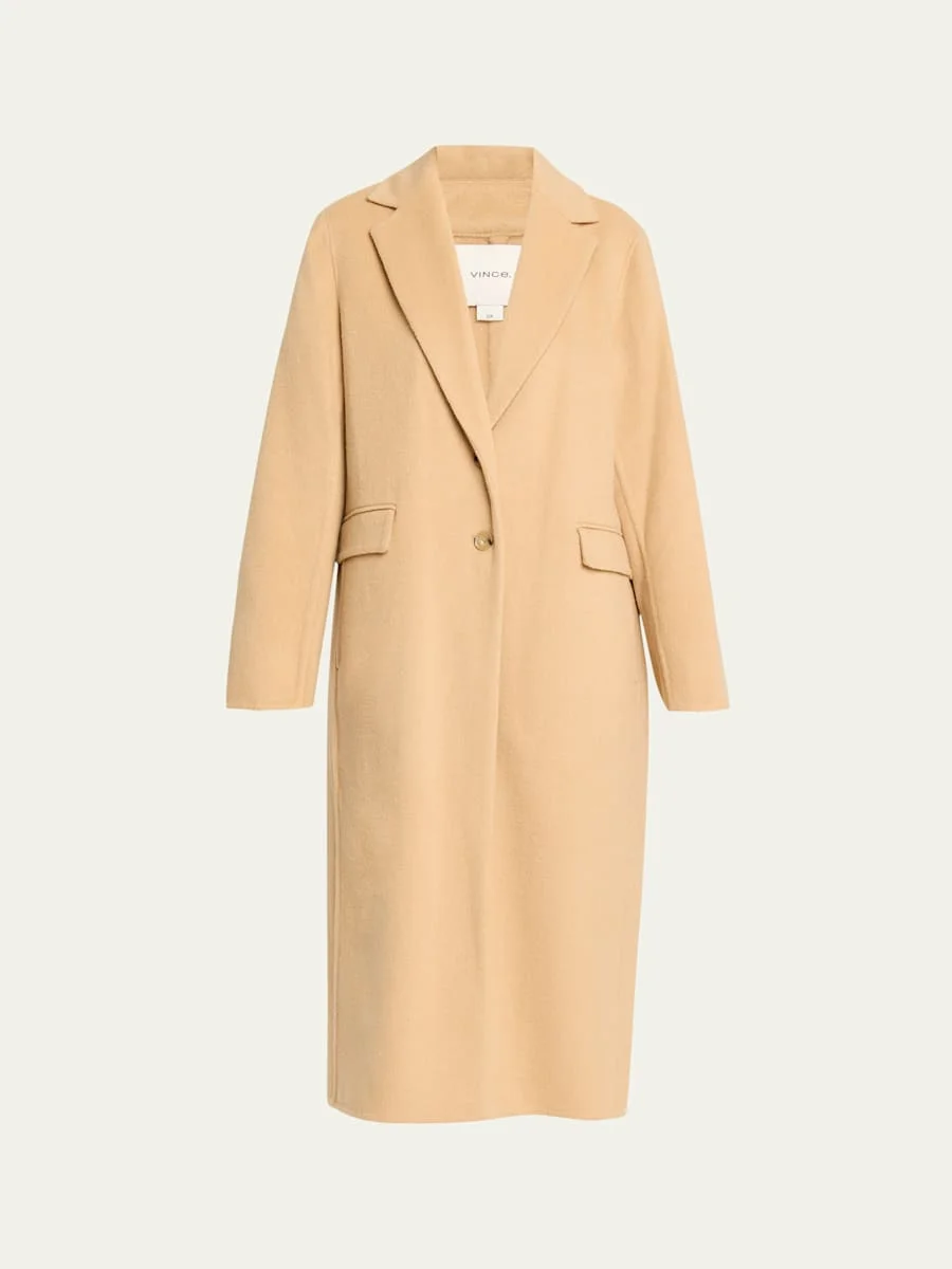 Luxurious cashmere and wool blend coat by Vince. Notch lapels Single-breasted front Long sleeves Side seam pockets; flap pockets Relaxed fit Walking vent Button-front Wool/cashmere Hand wash or dry clean Imported Online Inquiries: BGS21_T84BA| Store Inquiries: #5237248
