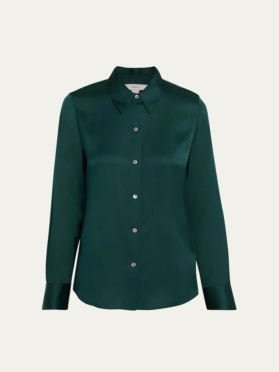 Vince classic stretch silk shirt Point collar Long sleeves with button cuffs Slim fit Hem falls to the hip Button-front Silk/viscose/spandex Hand wash cold or dry clean Imported Online Inquiries: BGS21_T6TYR| Store Inquiries: #5034980