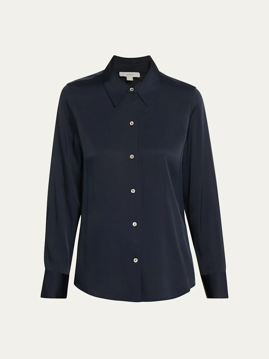 Vince classic stretch silk shirt  Point collar  Long sleeves with button cuffs Slim fit Hem falls to the hip  Button-front  Silk/viscose/spandex Hand wash cold or dry clean  Imported Online Inquiries: BGS21_T6TYR| Store Inquiries: #5034980