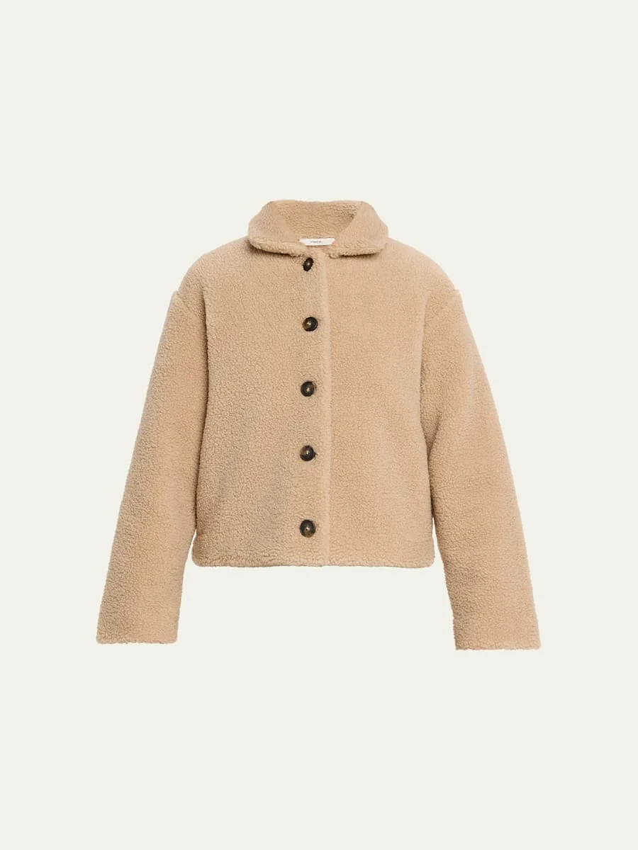 Vince ultracozy jacket crafted from plush sherpa Spread collar Long sleeves Side pockets Relaxed fit Hip length Buttonfront Polyester Lining: Cotton Hand wash cold Imported