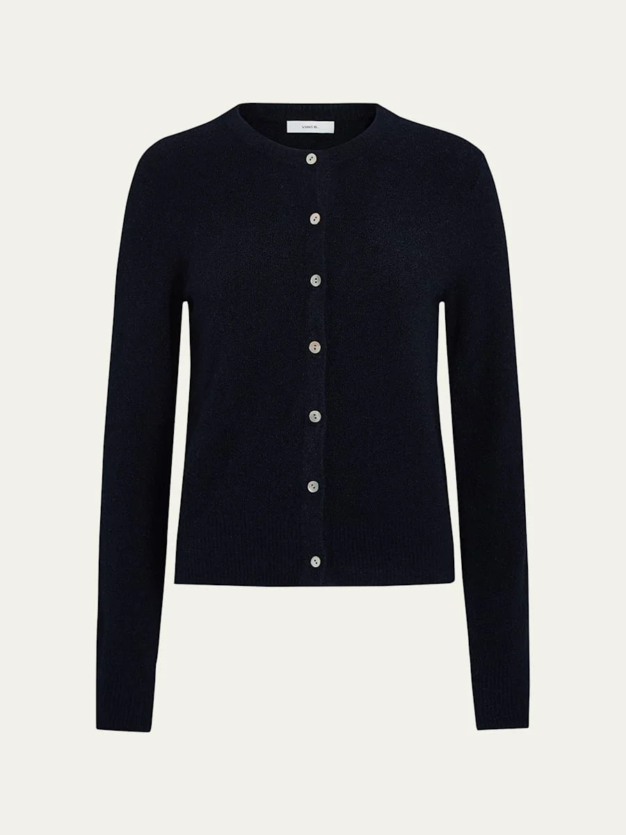 Vince soft boucle cardigan Crew neckline Long sleeves Classic fit Hem sits at the hip Button-front Silk/cashmere/nylon/polyamide Hand wash or dry clean Imported Online Inquiries: BGS21_T6TYX| Store Inquiries: #5034986