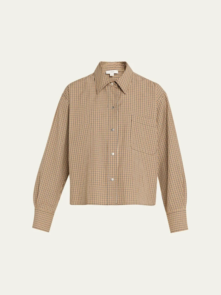 Vince ultrasoft cottonblend top adorned with a check motif Point collar Dropped shoulders Long sleeves with button cuffs Chest pockets Relaxed fit Cropped length Hidden buttonfront Cotton/modal Machine wash Imported SIZE amp; FITModel measurements: 5'10" tall Model is wearing a US size 4/Small