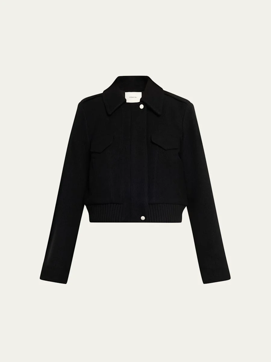 Structured wool-blend jacket finished with ribbed trim by Vince. Spread collar Long sleeves Dual flap pocket Side slip pockets Boxy fit Cropped length Hidden zip-front with snap-over placket Polyester/wool Dry clean Imported Proposition 65 warning for California residents This product contains perfluoroalkyl and polyfluoroalkyl substances (PFAS). For more information, please visit the manufacturer’s website. Online Inquiries: BGS21_T8QTL| Store Inquiries: #5359500