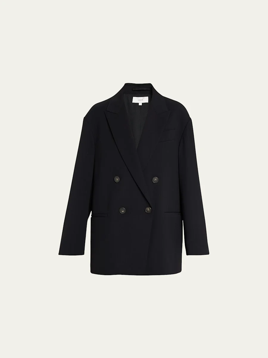 Vince menswear-inspired blazer constructed from crepe Peak lapels; double-breasted front Long sleeves Dropped shoulders Chest welt pocket; front welt pockets Oversized fit Vented hem Item runs large consider ordering a size down Polyester Imported Model is 5'10"/177cm. Online Inquiries: BGS21_T60T0| Store Inquiries: #4461382