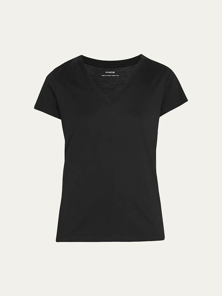 Vince essential V-neck T-shirt. Approx. 22.5"L down center back. V neckline. Short sleeves. Relaxed silhouette. Below-hip length. Pullover style. Pima cotton. Machine wash. Made in Peru. Online Inquiries: BGS21_T0C4E| Store Inquiries: #2472841