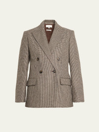 Vince houndstooth blazer finished with a double-breasted front Peak lapels Long sleeves with button cuffs Hip flap pockets Tailored fit Vented back Button-front Wool/polyester/viscose Dry clean Imported Online Inquiries: BGS21_T8RPJ| Store Inquiries: #5370106