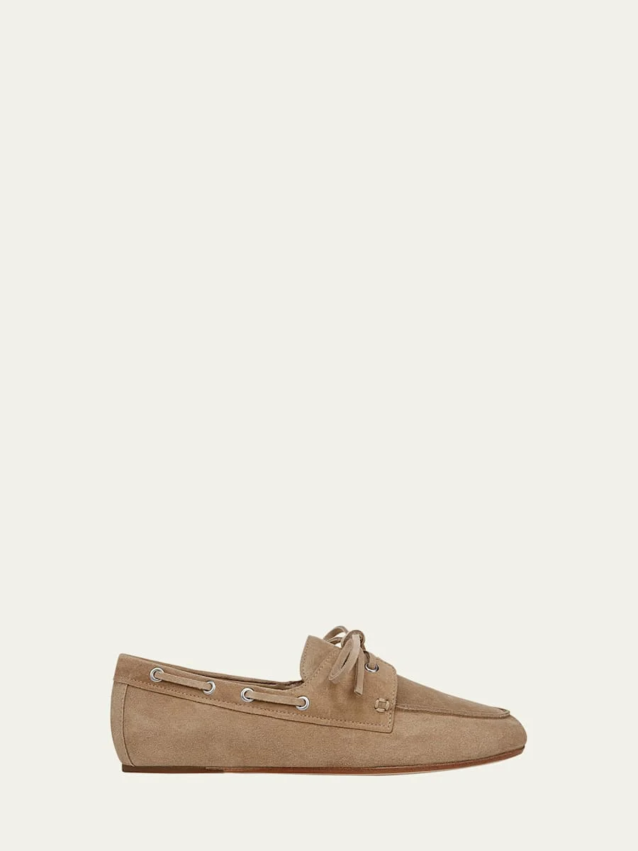 Vince "Marin" boat loafers crafted from buttery suede balanced with artisanal raw edges 0.25 in / 10 mm flat heel Round moc toe 360degree lacing Slipon style Leather outsole Lining: Leather Imported