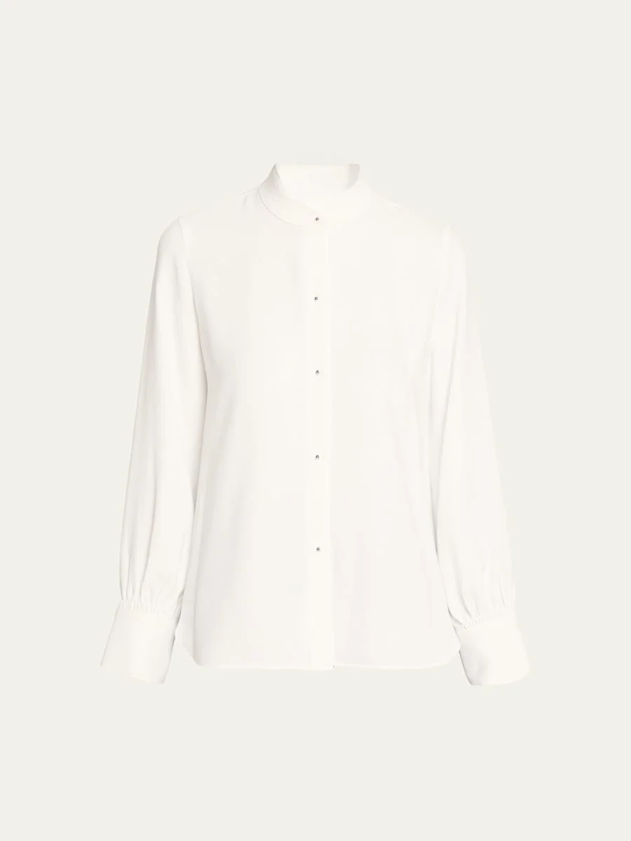 Matte crepe shirt adorned with metal ball buttons by Vince. Stand collar Long sleeves with button cuffs Classic fit Hem falls to the hip Buttonfront Polyester Dry clean Imported