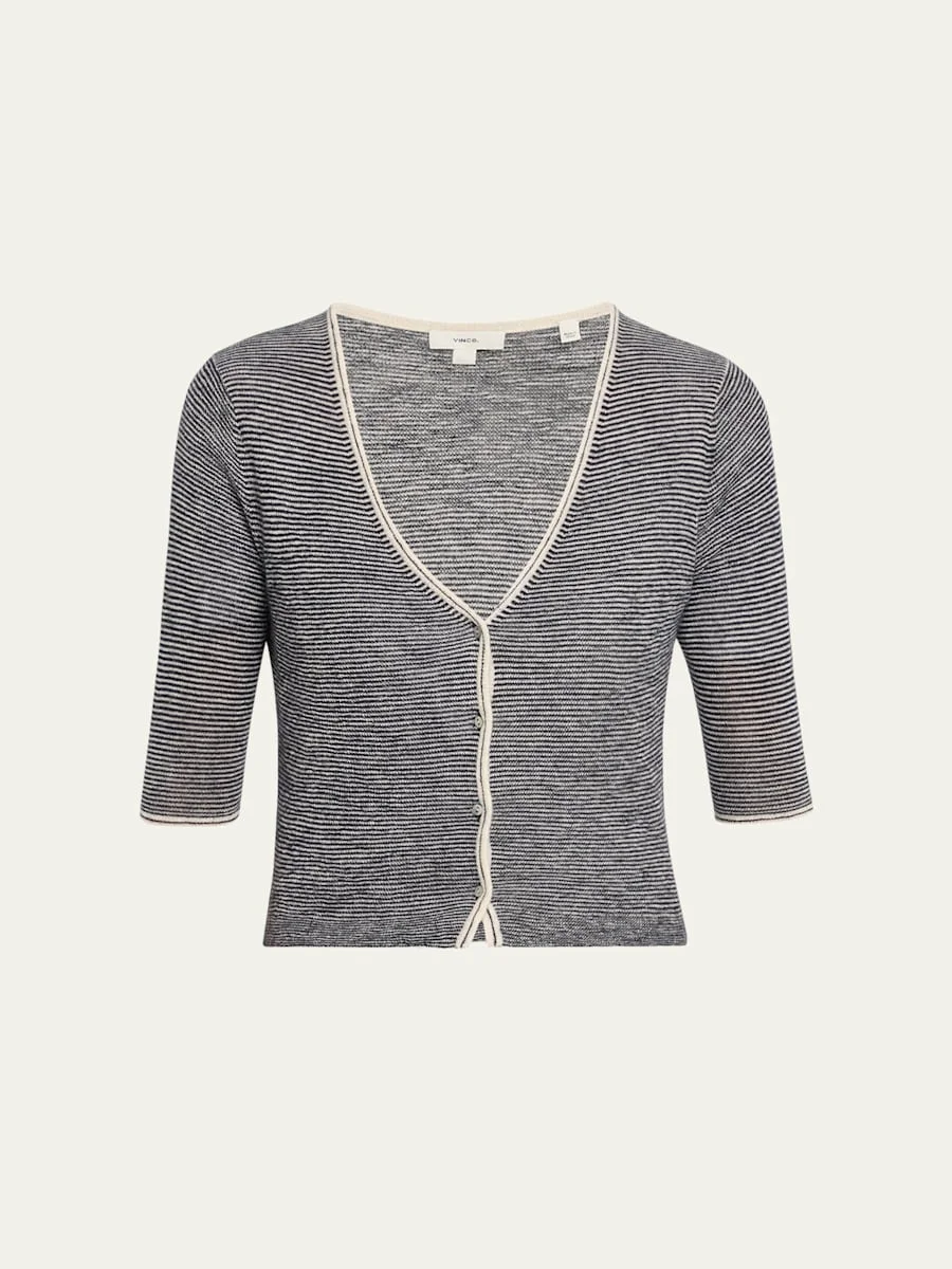 Vince micro-stripe cardigan crafted from a luxurious cashmere-silk blend V neckline Three-quarter sleeves Classic fit Hem sits at the hip Button-front Cashmere/silk Hand wash or dry clean Imported Online Inquiries: BGS21_T6TYW| Store Inquiries: #5034985