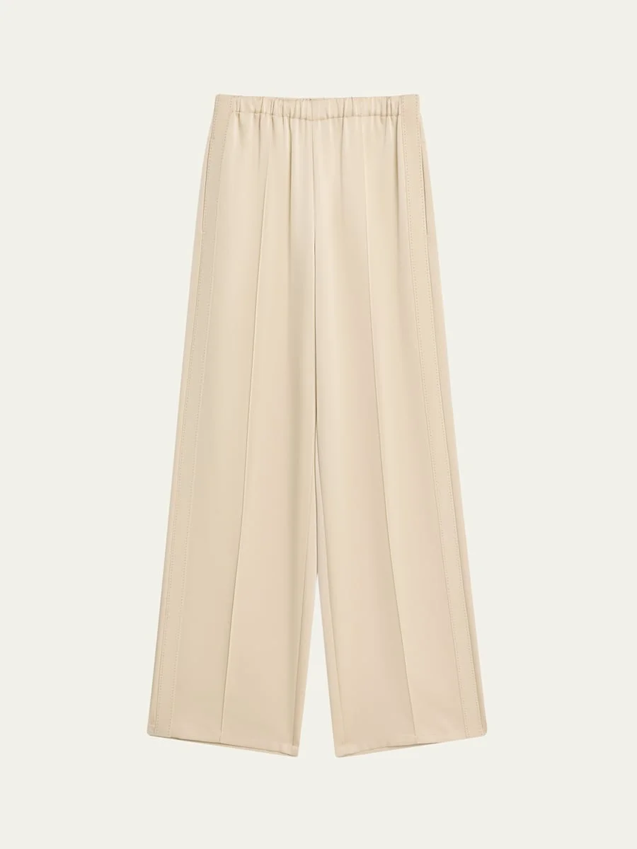 Vince silk-linen pants finished with tonal side straps Approx. 32.5" inseam Mid-rise; sits high on the hip Elastic waistband Four-pocket style Pintuck front Wide legs Full length Pull-on style Silk/linen Imported Online Inquiries: BGS21_T6TN5| Store Inquiries: #5033785