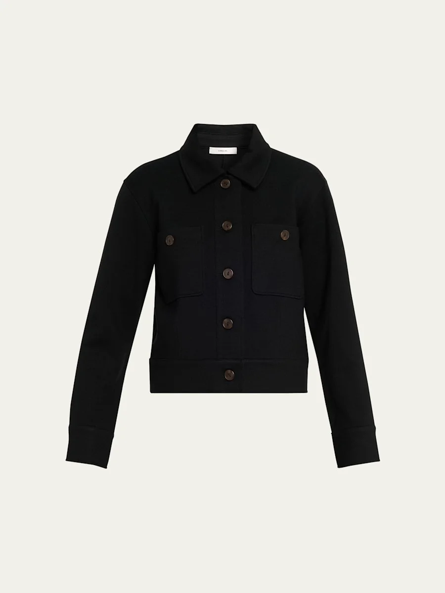 Vince classic jacket crafted from sleek ponte knit Point collar Long sleeves with button cuffs Dual chest pockets Classic fit Hem sits at the hip Buttonfront Acrylic/nylon/polyamide/wool Hand wash or dry clean Imported