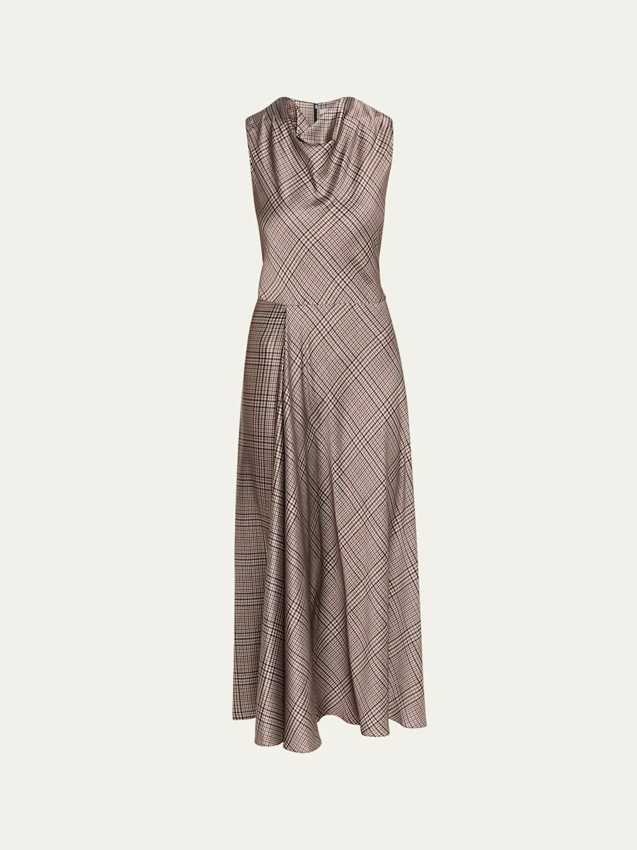 Satin maxi dress in a plaid print by Vince. Cowl neckline Sleeveless A-line silhouette Full length Center back zip Polyester Hand wash or dry clean Imported Online Inquiries: BGS21_T6YTL| Store Inquiries: #5070738