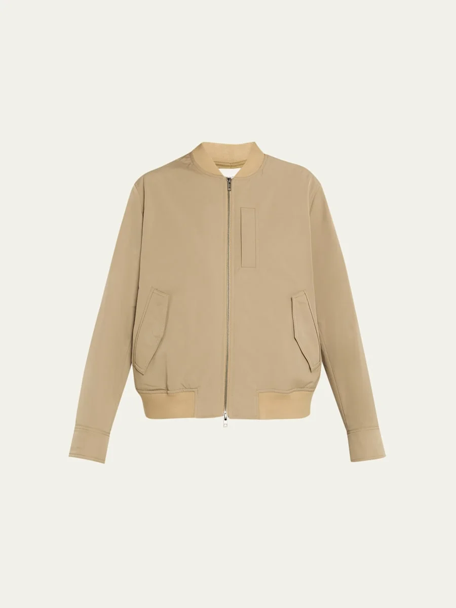 Vince bomber jacket crafted from a technical fabrication Baseball collar Long sleeves with snap cuffs Chest welt pockets; angled flap pockets Relaxed fit Banded knit hem Two-way zip-front Polyester/cotton/viscose Lining: Cotton Dry clean or machine wash cold Imported Online Inquiries: BGS21_T6TYG| Store Inquiries: #5034971