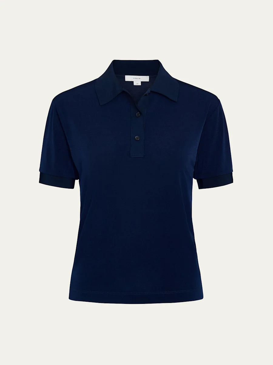 Vince solid knit polo top Point collar; button-placket Short sleeve Easy fit Hem falls to the hip Pullover style Polyester/spandex Imported Model is 5'10"/177cm. Online Inquiries: BGS21_T693B| Store Inquiries: #4934037