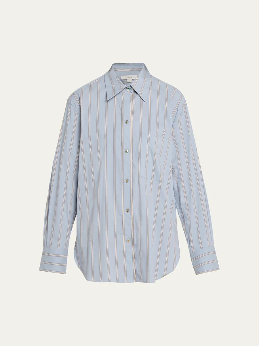 Vince striped shirt crafted from a crisp cottonblend Point collar Dropped shoulders Long sleeves with button cuffs Chest pocket Oversized fit Hem falls to the hip Buttonfront Cotton/nylon/polyamide/elastane Hand wash Imported