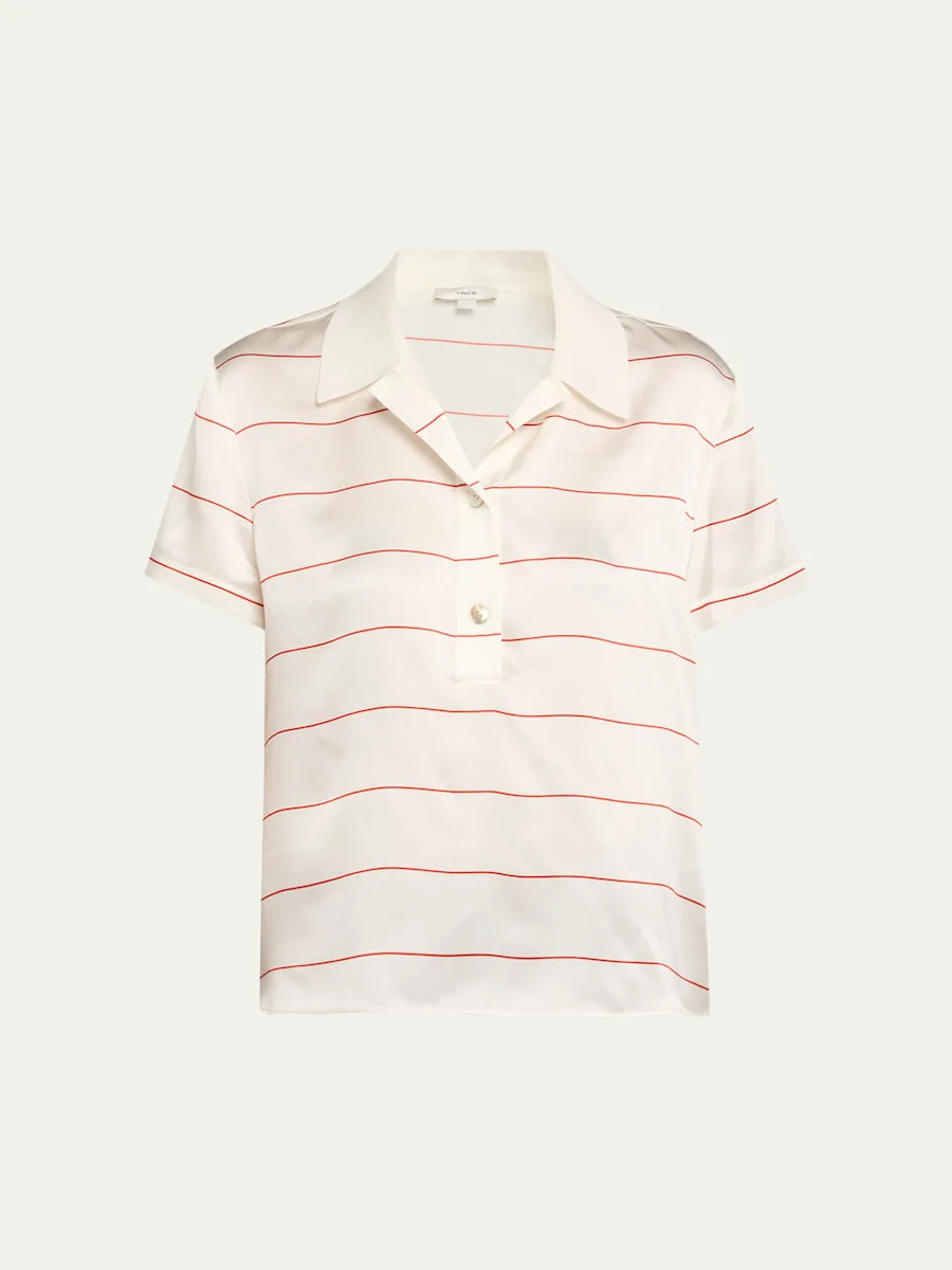 Vince striped silk polo shirt finished with a knit collar Short sleeves Relaxed fit Hem falls to the hip Button-placket Silk/viscose/nylon/polyamide Dry clean or hand wash Imported Online Inquiries: BGS21_T6TZ4| Store Inquiries: #5034993